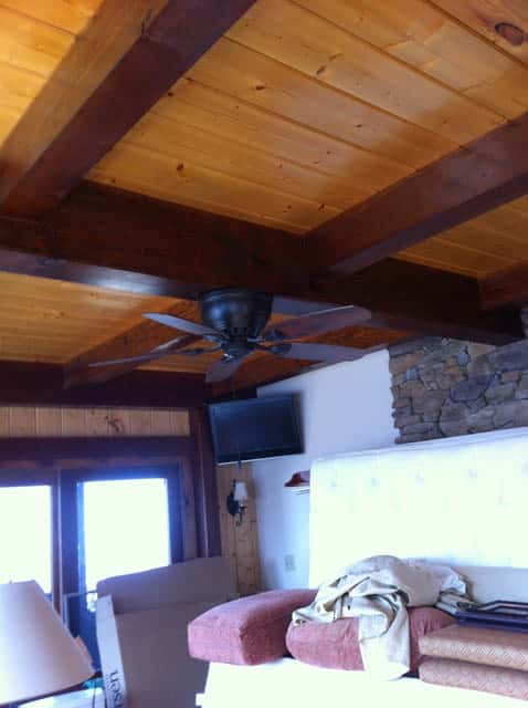 Speaking of the master bedroom. Remember those two posts that had to remain from the extension, I decided to build a custom bed around them. The custom bed has a built in dresser on the front side, which acts as a headboard on the backside, that we upholstered in a beautiful velvet chenille fabric. We will be adding sconces (by Robert Abbey) to the two posts at the top of the bed and added electrical for the functional and modern accent lamps also by Robert Abbey. The amazing sculptural piece is by Arteriors (www.arteriors.com). At the foot of the bed, which you can’t see, is a custom made bench with an amazing scroll fabric by Thibaut Designs (www.thibautdesigns.com). The jumping off point for color for this room is the client’s beautiful Ann Gish (www.anngish.com) bedding which has a beautiful gold tone. We added brand new, super soft and luxurious carpeting by Karastan, also in a soft grey. The walls are painted in Benjamin Moore Frostine and the beams are in Benjamin Moore’s Willow Creek.